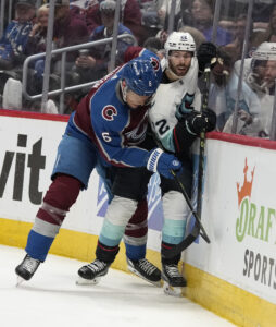 Colorado Avalanche defenseman Erik Johnson (6) checks Seattle Kraken right wing Oliver Bjorkstrand (22) in the second period of Game 7 of a first-round playoff series on Sunday, April 30 in Denver. Johnson signed a one-year deal worth $3.25 million with Buffalo. AP Photo