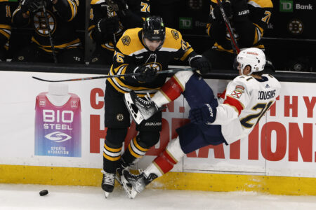 Boston Bruins defenseman Connor Clifton, left, checks Florida Panthers’ Nick Cousins off the puck during the first period of Game 1 of a first-round playoff series on Monday, April 17 in Boston. Clifton signed a 3-year $9.99 million deal with Buffalo. AP Photo