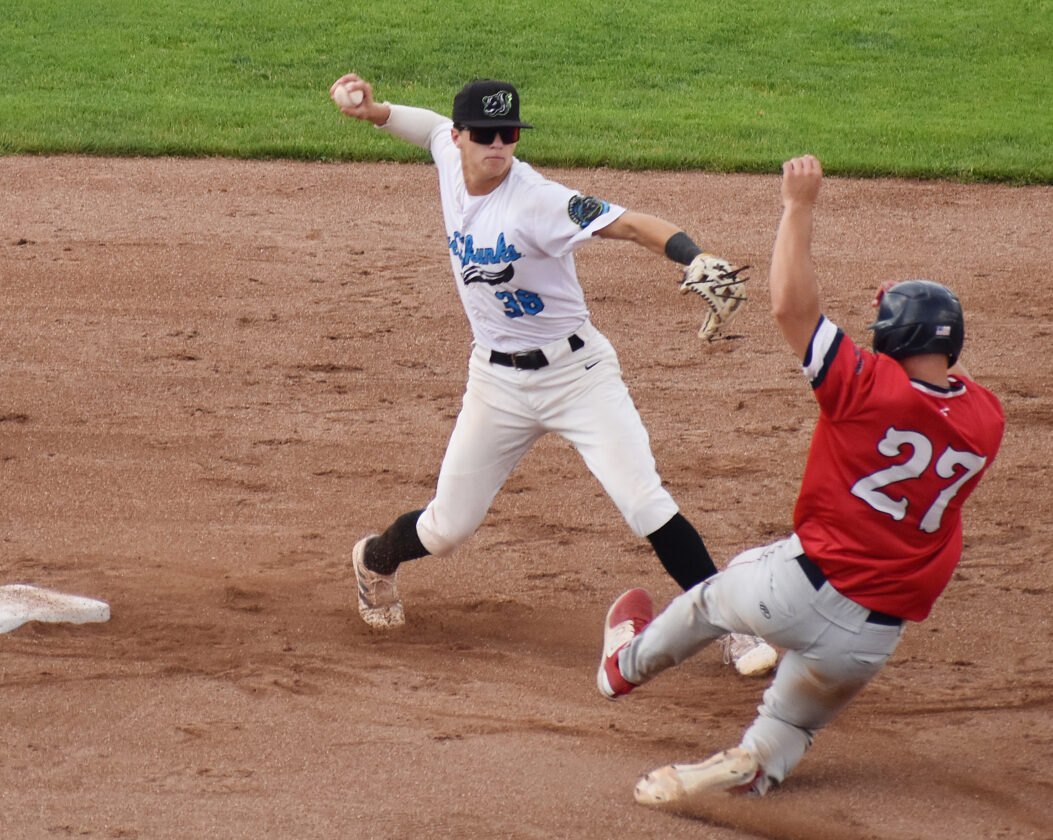 OBSERVER Photo by Scott Kindberg Jamestown Tarp Skunks shortstop Grady Mee turns a double play with Auburn Doubledays’ Bryce Moore sliding into second base during Game 1 of Sunday’s PGCBL West Division doubleheader at Diethrick Park in Jamestown.