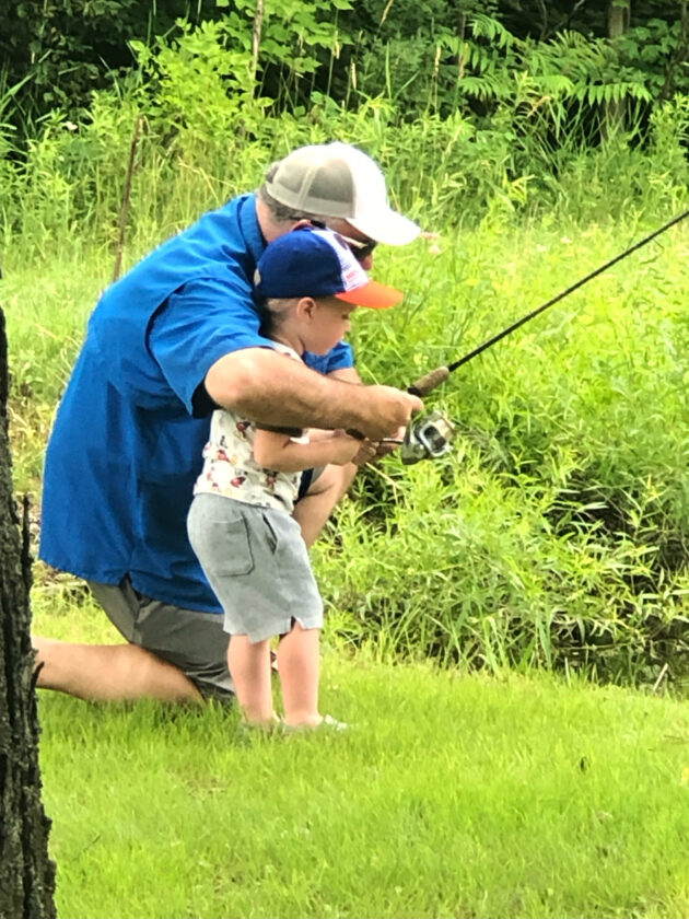 Young Carter Hinman receives his first fishing lesson. Submitted Photo