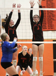 Fredonia’s Maddie Saunders (1) and Katherine Fortna (3) rise to contest at the net during Wednesday’s non-league volleyball match with the Westfield Wolverines at Fredonia High School. OBSERVER Photo by Braden Carmen