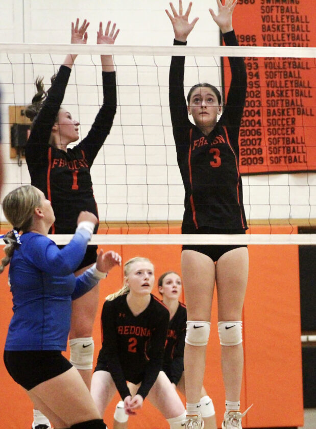- Fredonia’s Maddie Saunders (1) and Katherine Fortna (3) rise to contest at the net during Wednesday’s non-league volleyball match with the Westfield Wolverines at Fredonia High School. OBSERVER Photo by Braden Carmen