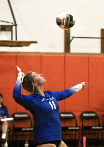 Westfield’s Sydney Hotchkiss (11) serves during Wednesday’s non-league volleyball match between the Westfield Wolverines and the Fredonia Hillbillies at Fredonia High School. OBSERVER Photo by Braden Carmen