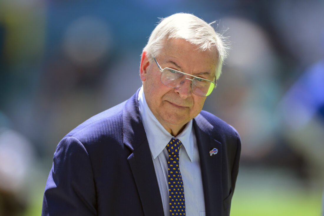 Buffalo Bills owner Terry Pegula walks on the sidelines during an NFL game against the Miami Dolphins on Sunday, Sept. 25, 2022, in Miami Gardens, Fla. The NFL Buffalo Bills and NHL Buffalo Sabres will operate as separate entities after the teams’ owner Terry Pegula dissolved their parent company. The move to dissolve Pegula Sports and Entertainment is being referred to as one that will allow each of the teams to focus singularly on their efforts. AP Photo