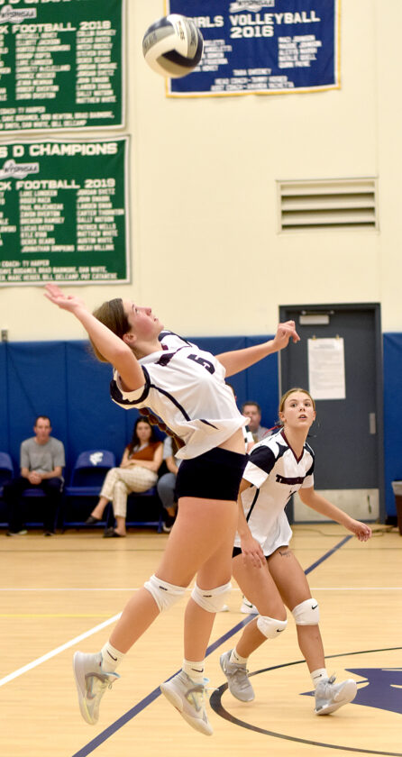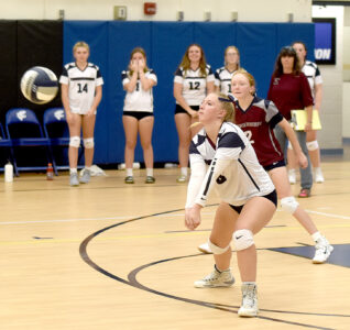 - OBSERVER Photo by Matt Spielman Chautauqua Lake’s Ava Olson receives a serve as teammate Alice Scarpine looks on during Wednesday’s CCAA Division 2 West volleyball match against Panama in Panama.