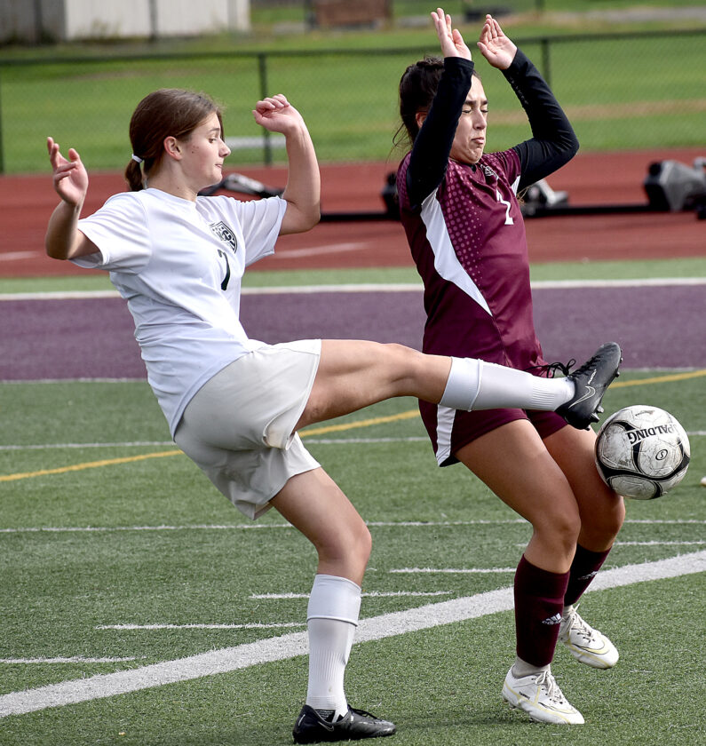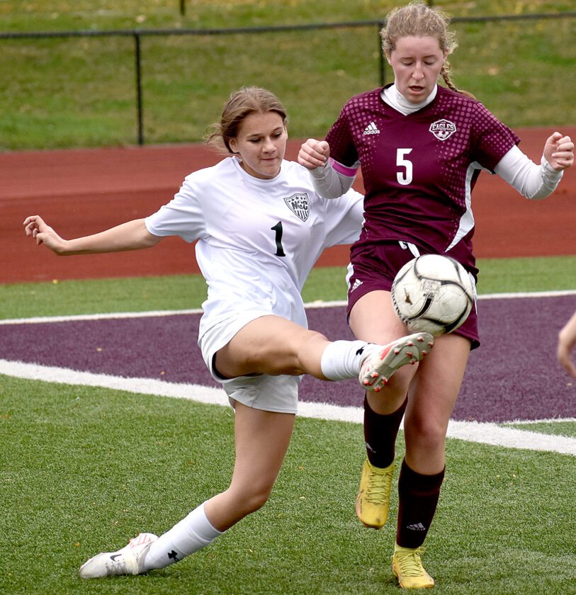 OBSERVER Photo by Matt Spielman North Collins' Jenna Sickau kicks at the ball in front of Ellicottville's Addison John during Saturday's Section VI Class D championship game at Karl Hoeppner Field in Dunkirk.