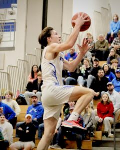 Westfield junior guard Carson Swanson leaves his feet on a breakaway layup during the second half of a game against the North Collins Eagles on Thursday night at the Westfield Winter Classic boys basketball tournament at Westfield Academy. OBSERVER Photo by Braden Carmen