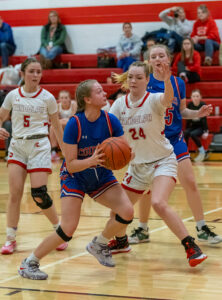 Cassadaga Valley’s Breonna Hopkins looks for a shot while being defended by Randolph’s Zoelle Dickerson during Friday’s CCAA Division 1 East game in Randolph. Photo courtesy of Mike Frame