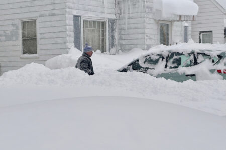 Patrick Sahr is out just after sunrise shoveling snow from his car and driveway after at least 18 inches of new snow fell overnight — on top of the 3 feet that arrived over the weekend in Buffalo on Wednesday. AP Photo