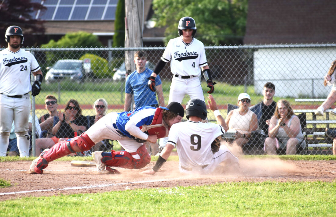 - OBSERVER Photo by Christian Storms Above, Fredonia’s Andrew Cowan scores the winning run against Newfane in Monday’s Section VI Class B quarterfinal playoff game.