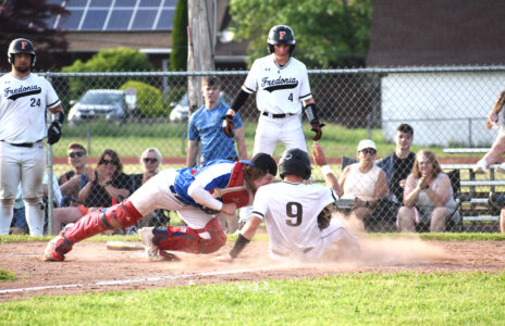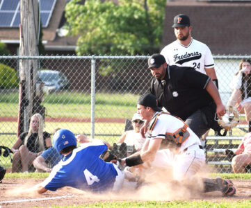 OBSERVER Photo by Christian Storms Above, Fredonia’s Andrew Cowan scores the winning run against Newfane in Monday’s Section VI Class B quarterfinal playoff game.