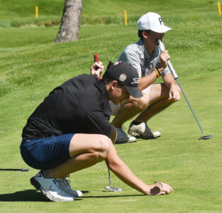 OBSERVER Photo by Scott Kindberg Fredonia’s Ryan Kelly (top) and Chautauqua Lake/Westfield/Brocton’s Carson Swanson line up their putts on the first green during Wednesday’s Chautauqua-Cattaraugus Athletic Association golf match on the Lake Course at Chautauqua Golf Club.