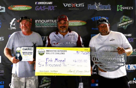 - Innovative Outdoors Walleye Challenge contest winners, Team “Fish Missle” with Captain Jim Taggert, middle, Joe Boone, left, and Dave Salvalzo with their winning walleye box of 35.97 pounds. Photo by Steel Outdoors Group