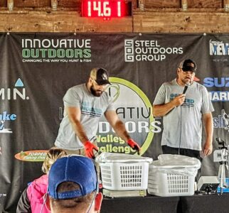 - Above is the Innovative Outdoors Walleye Challenge weigh-station with Tournament Director Jim Steel, right, providing announcements and humor to more than 200 onlookers at the Clarion Hotel Pavilion on Chadwick Bay last weekend. Photo by Forrest Fisher