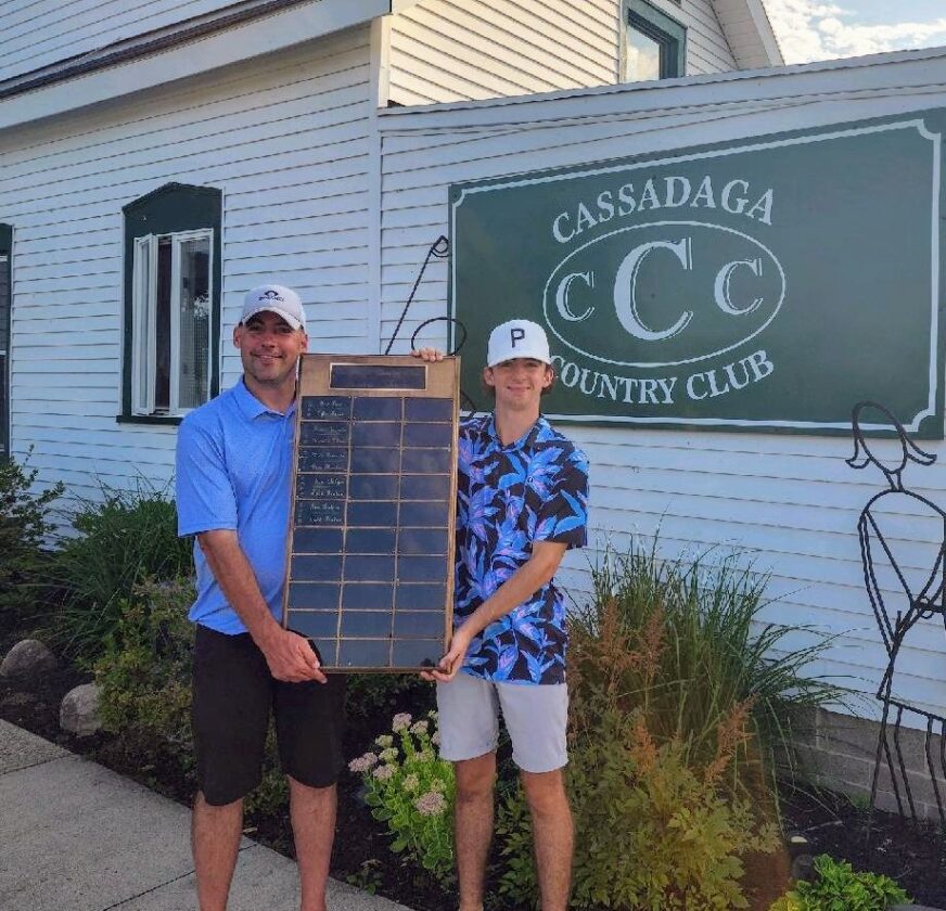 Following a three-team playoff, the father-son team of Brad Kelly, left, and Ryan Kelly, right, won the 2024 Cassadaga Country Club Member-Member championship. The one-day, 27-hole tournament featured scramble, best ball and alternate shot formats. Team Kelly was victorious on the second playoff hole. Finishing in second place was another father-son team of Fred Stern and Nick Stern. Third place went to Rob Lancaster and Matt Wallace. Finishing one stroke behind the playoff teams for fourth place was the team of Michele Helmer and Scott Jagoda. To round out the top five finishers was the team of Mike Lancaster and Dave Meadows.
