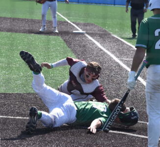 - Dunkirk catcher Gabe Valentine tags out Lewiston-Porter’s Brandon Tamul at the plate during Thursday’s Section VI Class A2 final at Frontier High School. OBSERVER Photo by Christian Storms