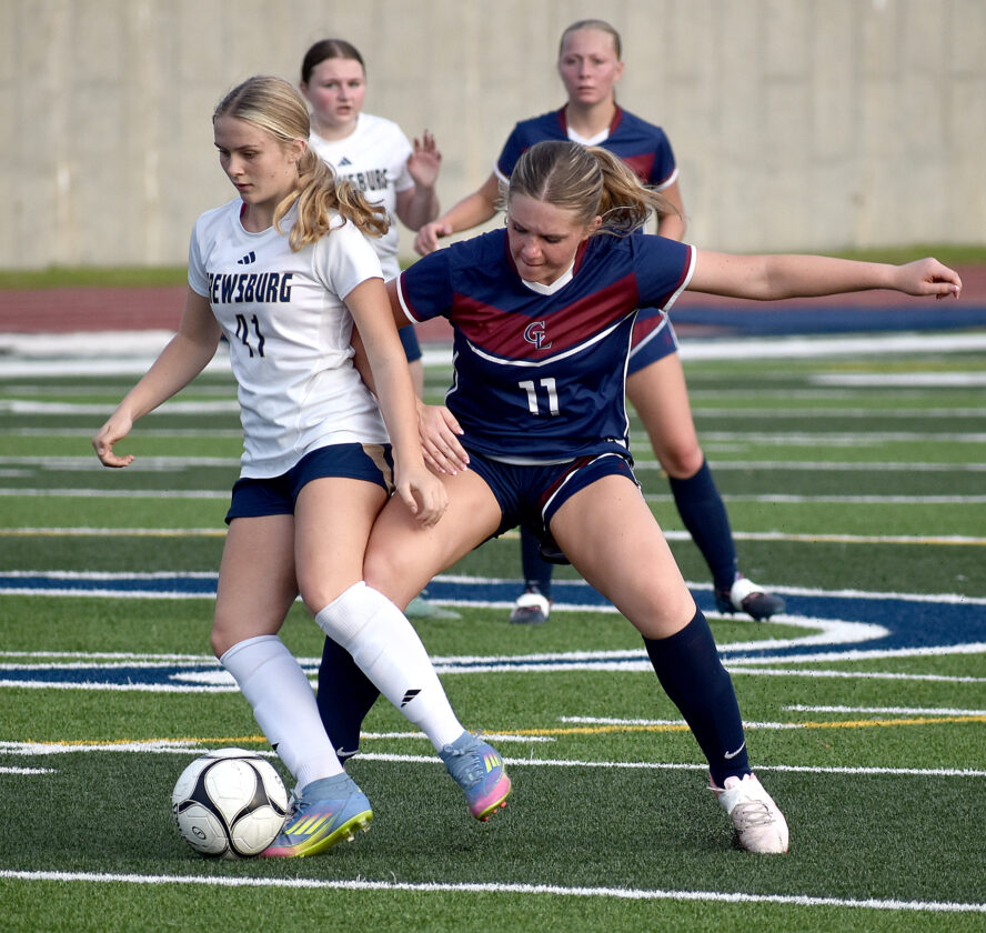 - OBSERVER Photo by Matt Spielman Chautauqua Lake’s Olivia Aman, right, attempts to get the ball from Frewsburg’s Presleigh Stelmack during Monday’s CCAA D3 game in Mayville.