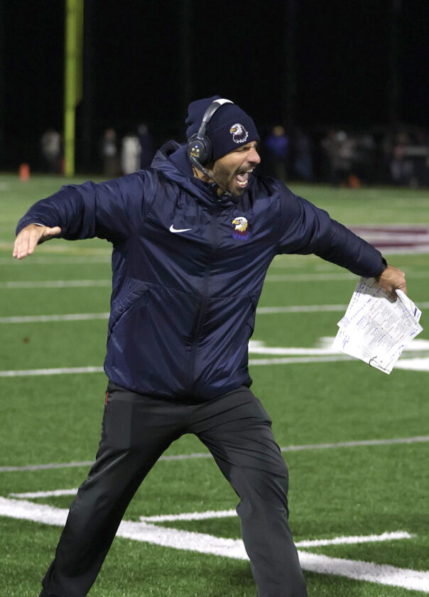 - Photo courtesy of Cody Jacobson Chautauqua Lake/Westfield/Brocton head coach Ty Harper celebrates during Friday’s Class C football semifinal against Barker/Royalton-Hartland.