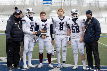 Photo courtesy of Cody Jacobson Chautauqua Lake/Westfield/Brocton captains Brayden Gibbs (5), Carson Fairbank (4), Asher Olson (8) and Trent Houser (58) accept the NYSPHSAA Class C West Semifinalist plaque with head coach Ty Harper, far right, after falling to Chenango Forks on Saturday in Cicero.