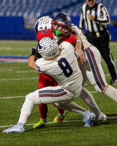 - Chautauqua Lake/Westfield/Brocton’s Asher Olson brings down Southwestern/Frewsburg’s Trent Lewis during the Section VI Class C championship game at Highmark Stadium in Orchard Park. Photo courtesy of Cody Jacobson