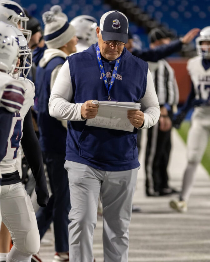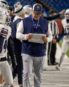 - Chautauqua Lake/Westfield/Brocton defensive coordinator Chris Payne looks at his play sheet during the Section VI Class C championship game at Highmark Stadium in Orchard Park. Photo courtesy of Cody Jacobson