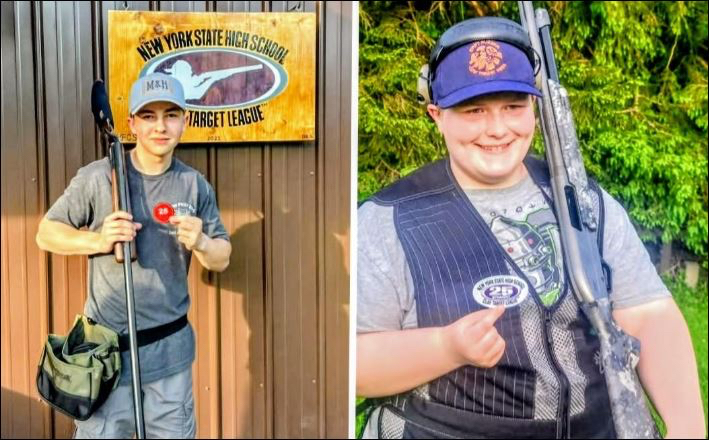 - Erik Galuski, left, and Sienna Christensen, right, have scored several perfect shooting scores of 25 out of 25 for the East Aurora High School trap team. The team finished the season in first place among seven teams in Conference 3 of the New York State Clay Target League last week. Photo courtesy of John Christensen