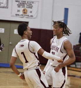 Dunkirk’s K’Vion Tell, left, and Malik McCall, right, celebrate during the second half of a Chautauqua-Cattaraugus Athletic Association Division 1 boys basketball game against the Southwestern Trojans on Monday at Dunkirk High School. OBSERVER Photo by Braden Carmen