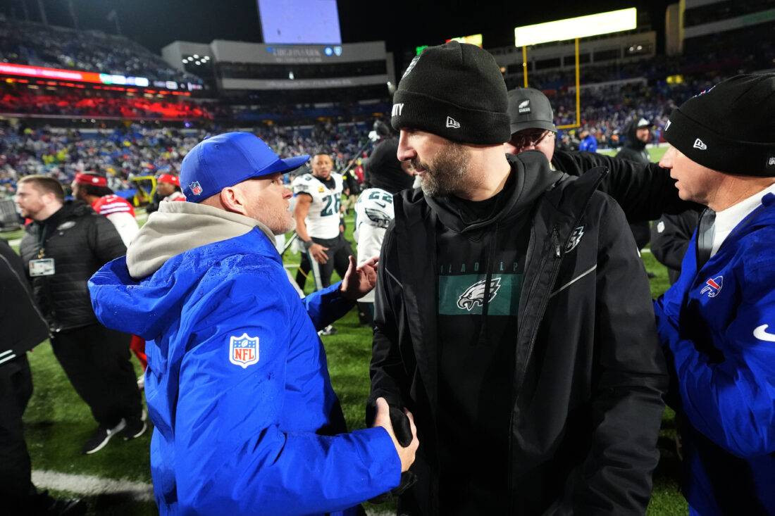 Philadelphia Eagles head coach and Jamestown native Nick Sirianni, right, and Buffalo Bills head coach Sean McDermott meet after Sunday’s game in Buffalo. AP Photo