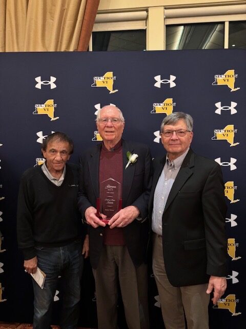 Former Clymer Central School boys basketball coach Bob Winner, middle, was enshrined into the Section VI Hall of Fame during an induction ceremony Thursday at The Columns Banquets in Elma. He is pictured with two other former Chautauqua County basketball coaches, Mike Tramuta, left, and Dave Polechetti, who were in attendance to support Winner. The Section VI Hall of Fame was established to honor and recognize those, within its organization, who excelled in their roles as athletes, administrators, coaches, officials or contributors who have provided meritorious service.