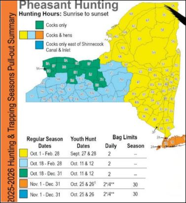 - NYSDEC Illustration The pheasant season for 2025-26 continues through the holiday period for many areas of New York state.