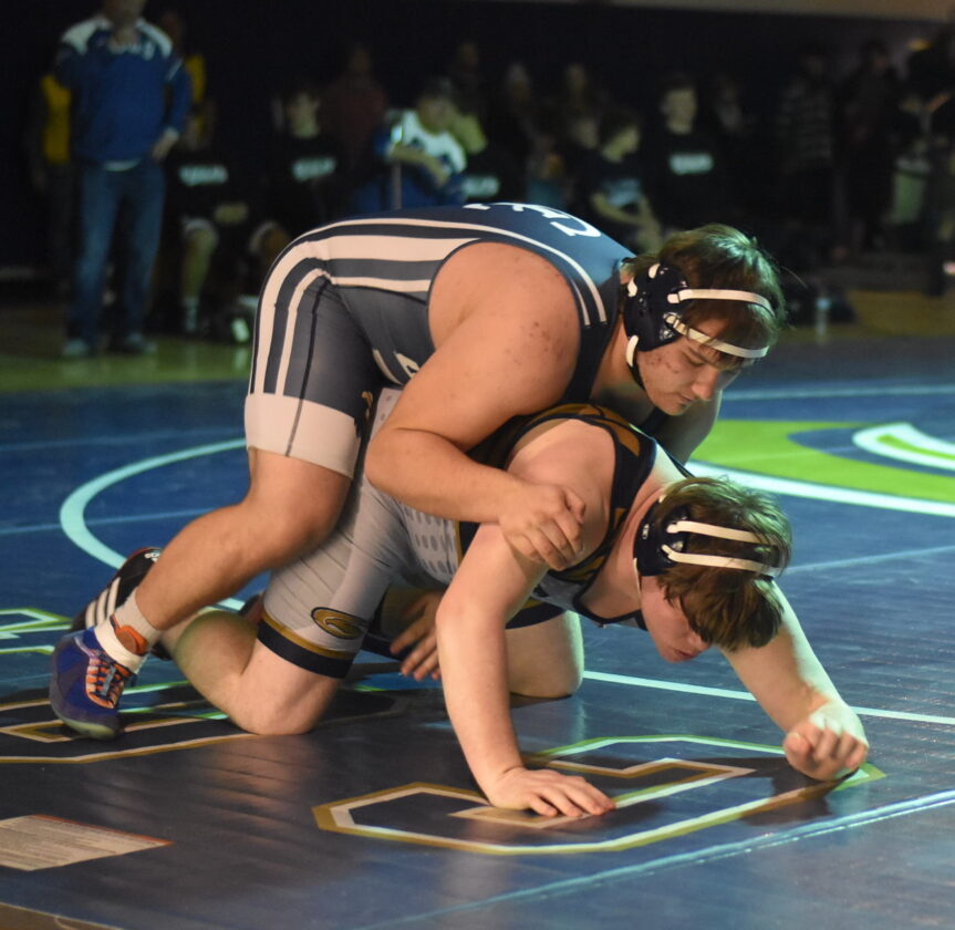 The Golden Cougars’ Dylan Newman works on a pin of the Eagles’ Logan Fuller. OBSERVER Photo by Christian Storms