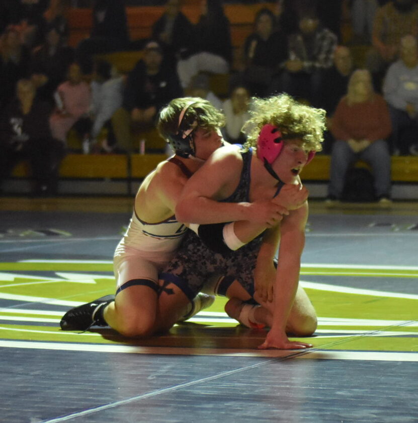 - The Golden Cougars’ Dylan Newman works on a pin of the Eagles’ Logan Fuller. OBSERVER Photo by Christian Storms