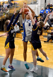 OBSERVER Photo by Matt Spielman Sherman’s Emmersen Crawford attempts to drive to the basket between Westfield’s Sophia Wolfe, left, and Reagan Weingart during Chautauqua-Cattaraugus Athletic Association Division 2 girls basketball action Thursday in Westfield.