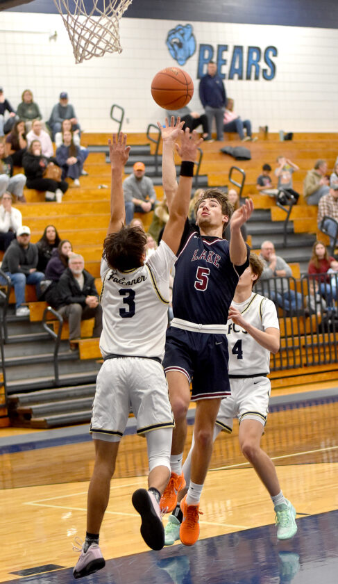 OBSERVER Photo by Matt Spielman Chautauqua Lake’s Brayden Gibbs shoots over Falconer’s D’mitri Carlson (3) during the opening round of the Frewsburg Holiday Tournament on Friday in Frewsburg.