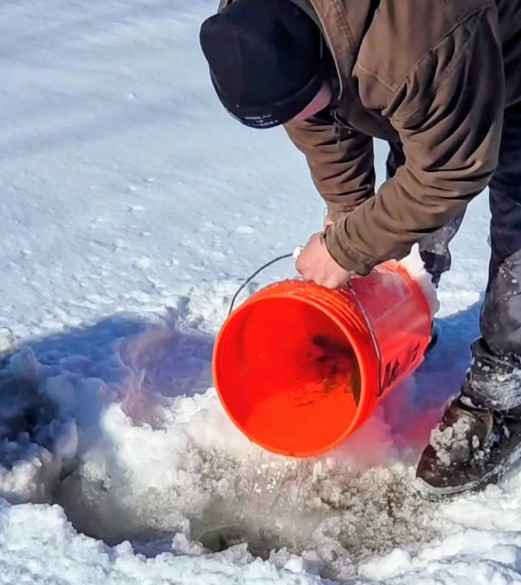 NYSDEC staff drilled a hole through the 10-inch-thick ice to release the musky fingerlings into the lake from the musky expo aquarium. Photo courtesy of Katia Rivers
