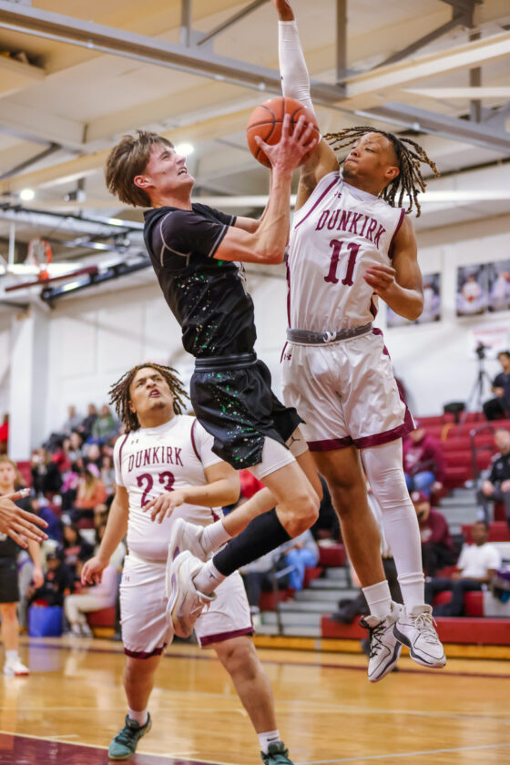 Dunkirk’s Malik McCall attempts to block a shot attempt by Allegany-Limestone’s Nolan O’Brien during Wednesday’s CCAA Division 1 boys basketball game at Dunkirk High School. OBSERVER Photo by Ashleigh Brown