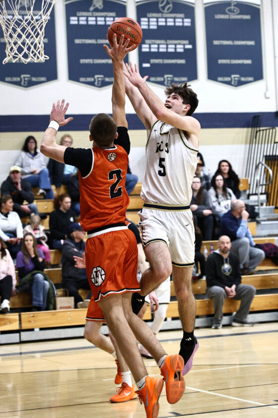 Photo courtesy of Steve Garvey Fredonia’s Donovan Dowdy challenges Falconer’s Max Parmentier in the lane during CCAA Division 1 boys basketball action in Falconer on Friday.