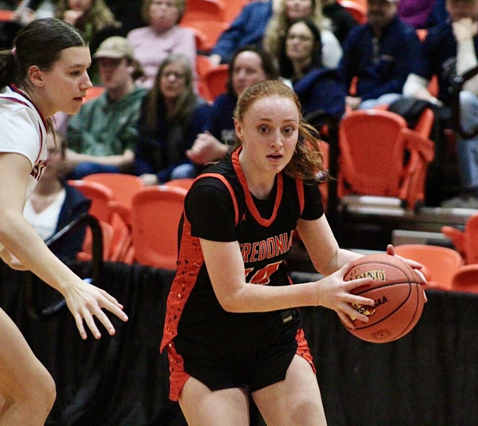 - Fredonia’s Juliana Snyder looks to pass while driving the baseline in a Section VI, Class A2 girls basketball semifinal playoff game on Saturday afternoon at Buffalo State University. OBSERVER Photo by Braden Carmen.