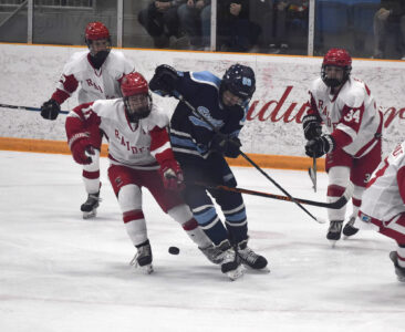 - Jamestown’s Ture Fagerstrom, left, and Dunkirk/Fredonia’s Ryan Wegrzynowski, right, battle along the boards as their teammates Ty Barron, left, and Caleb Kimmerly, right, provide defensive support in Game 2 of a Western New York High School Club Hockey League Mixed School Division playoff game at Northwest Arena in Jamestown on Thursday. OBSERVER Photo by Christian Storms