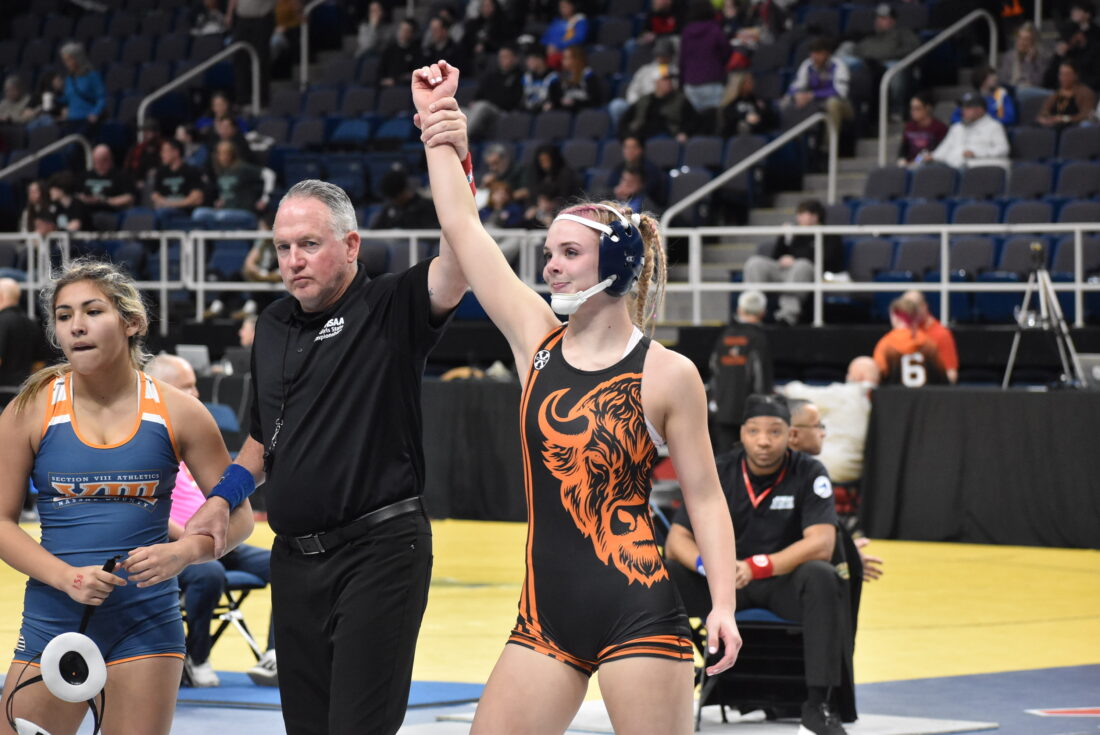 After taking third place as a freshman, the sophomore Paddock has returned to states hungry for a spot on the podium again. The 138-pound 3-seed took just 1:09 in her opening match against No. 14 A Dignean of Phoenix-III before finding a pin and then Paddock’s quarterfinal match was even better with a 58 second pin over Taylor Brock of MacArthur-VIII.