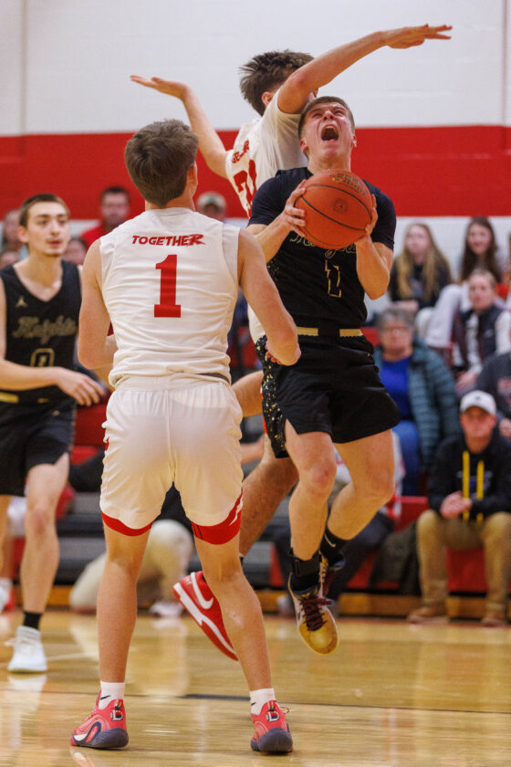 Silver Creek’s Andrew Arnold goes between two Randolph defenders for a layup during CCAA Division 3 basketball action on Tuesday. Photo courtesy of Mike Frame
