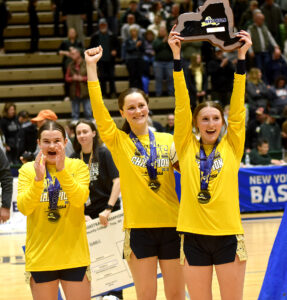 OBSERVER Photo by Matt Spielman Frewsburg’s Jadyn Trocki holds up the NYSPHSAA Class C championship plaque alongside teammates Abery Harvey, center, and Jaden Jimerson, left, after the Bears beat Greenwich in the state title game Saturday evening at Hudson Valley Community College in Troy.