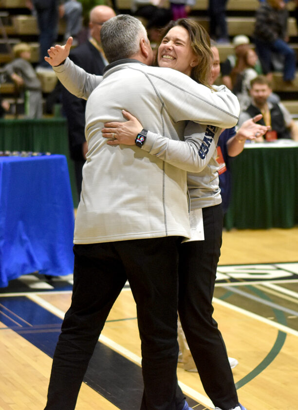 AP Photo Frewsburg head coach Sierra Beaver hugs assistant coach Jamie Sposato after the final horn.