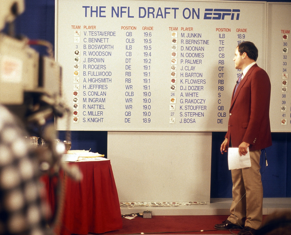 ESPN’s Chris Berman looks at the 1987 draft board. Frewsburg native Shane Conlan was graded 10th overall and was ultimately selected No. 8 in the first round by the Bills. AP Photo
