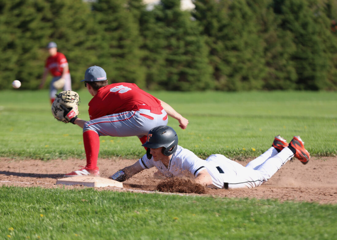 - OBSERVER Photo by Ashleigh Brown Fredonia’s Matt Cowan slides back to first base behind Salamanca first baseman Nolan Seeley in Chautauqua-Cattaraugus Athletic Association Division 1 action Wednesday at Fredonia High School.