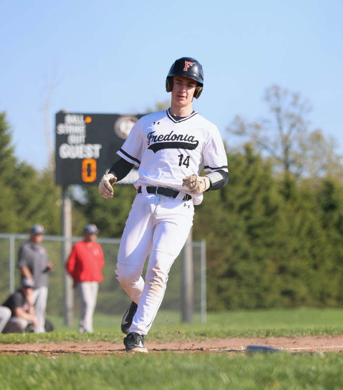 - OBSERVER Photo by Ashleigh Brown Fredonia’s Jack Frame scores a run during Chautauqua-Cattaraugus Athletic Association Division 1 action against Salamanca on Wednesday.