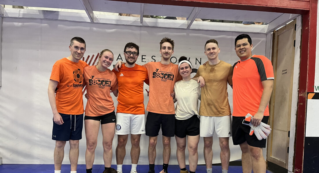 - Orange beat Purple in the championship game of the Coed Blue Division winter soccer league at the Lakewood YMCA. Pictured, from left, are: Scott Robertson, Lexi Lindamer, Andy Robertson, Austin Myles, Abbie Merchant, Chris Waclawski and Javier Castro. Submitted photo