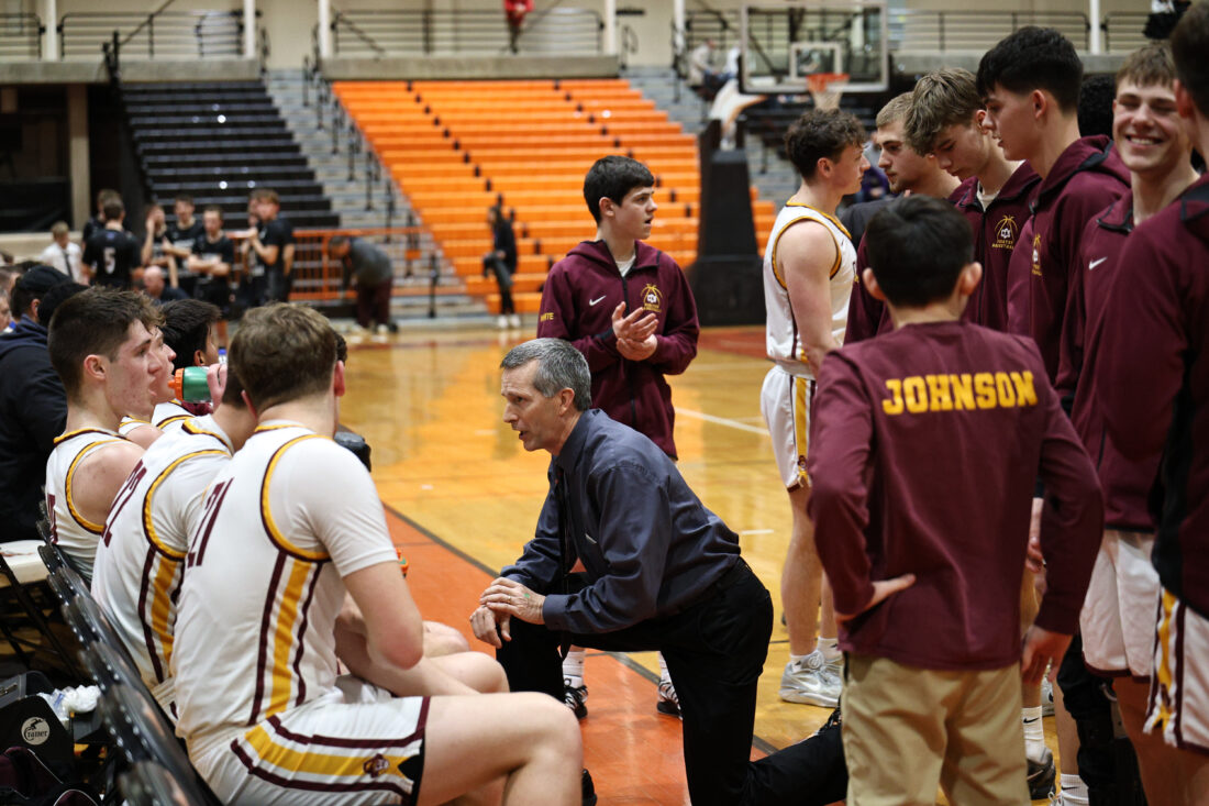 Clymer head coach Irv King talks to his players during a timeout in the Class D Far West Regional at the Buffalo State Sports Arena. OBSERVER Photo by Cody Jacobson