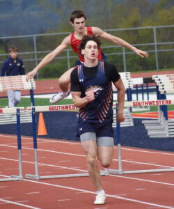 - Falconer/Cassadaga Valley’s Reese McKay, front, and Southwestern’s Kellan Brown compete in the 400-meter intermediate hurdles in Chautauqua-Cattaraugus Athletic Association Division 1 boys track and field action at the Sirianni Athletic Complex on Tuesday. OBSERVER photo by Scott Kindberg