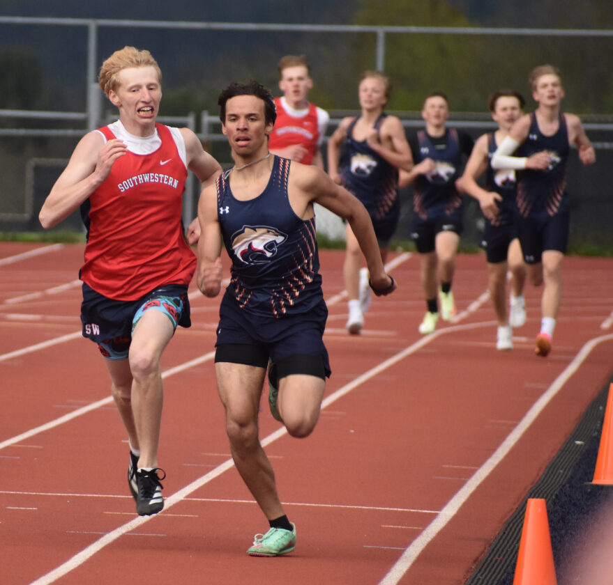 - Falconer/Cassadaga Valley’s Dimitri Carlson, right, stays ahead of Southwestern’s Landon Hooks to win the 800 meters in Chautauqua-Cattaraugus Athletic Association Division 1 boys track and field action on Tuesday at the Sirianni Athletic Complex. OBSERVER photo by Scott Kindberg